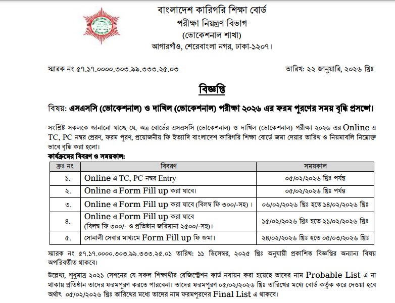 | 1 | এসএসসি (ভোকেশনাল) পরীক্ষা ২০২৬ এর ফরম ফিলাপের সময় বৃদ্ধির বিজ্ঞপ্তি | ২৩/০১/২০২৬ | Download |